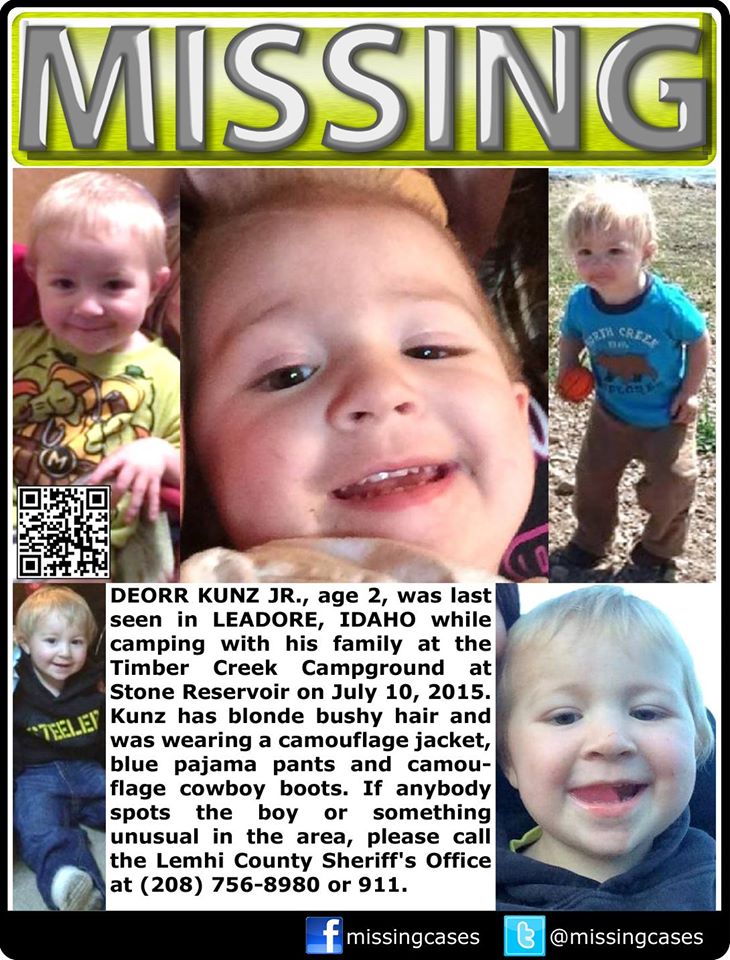 According to Sgt. Jeff Edwards, a woman at the Ammon Walmart called the Lemhi County Sheriff’s Office around 3:45 p.m. She told detectives she spotted a boy she believed could have been Deorr Kunz Jr. with a man. The two-year-old disappeared while camping with his family in Leadore, Idaho on Friday.
