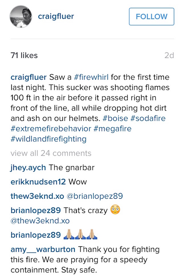 Firefighter Craig Fluer posted the video on his Instagram account Saturday. He wrote, “Saw a #firewhirl for the first time last night. This sucker was shooting flames 100 ft in the air before it passed right in front of the line, all while dropping hot dirt and ash on our helmets.”