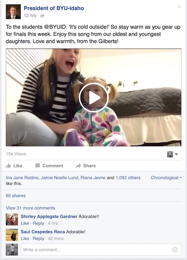 Gilbert posted the video to his Facebook page Sunday night and it’s quickly spreading across the BYU-Idaho campus.