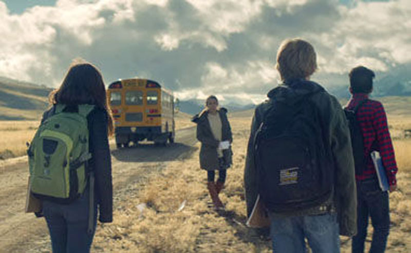 The advertisement shows a school bus dropping four students off in the middle of nowhere as the fifth child waves at them from the bus. The scene is meant to illustrate the claim that 4 out of 5 Idaho students are not prepared for life after high school.