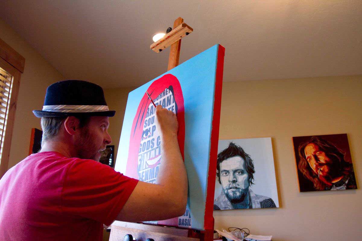 He’s also the type that will offer you something cool to drink and lead you right into his office-turned studio in his Victor home. This is where his works are born, in acrylic, where there are no security guards in red blazers waiting to tell you to “Please step back from the painting.”