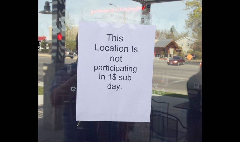 IDAHO FALLS — If you were hoping to get a $1 sandwich from Jimmy John’s today, you will have to drive quite a ways.
