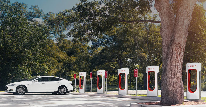 To charge an EV at home, the owner has to plug it in before going to bed. That’s because alternating current is being used. At a supercharging station it’s direct current that’s used, but it’s still not as fast as filling the tank and hitting the road. A charging session takes about half an hour, which is why Tesla puts its stations in locations where there are restaurants and stores nearby.
