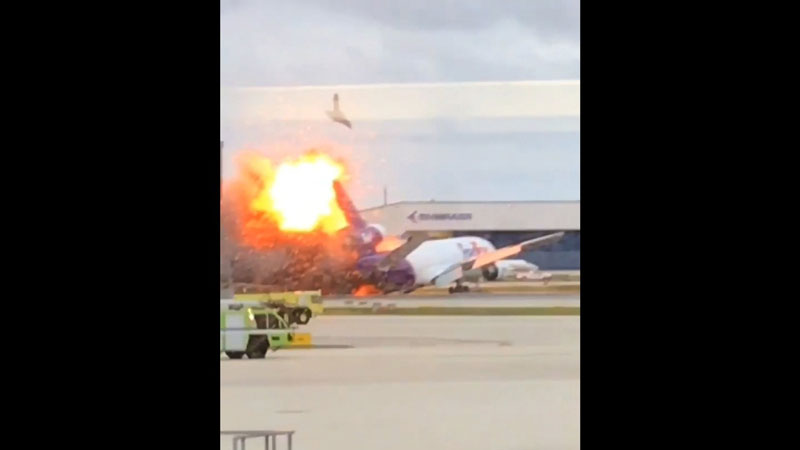 Video shot by an onlooker at the airport showed a fireball exploding out of the damaged aircraft and recorded the startled cries of people watching the flames.