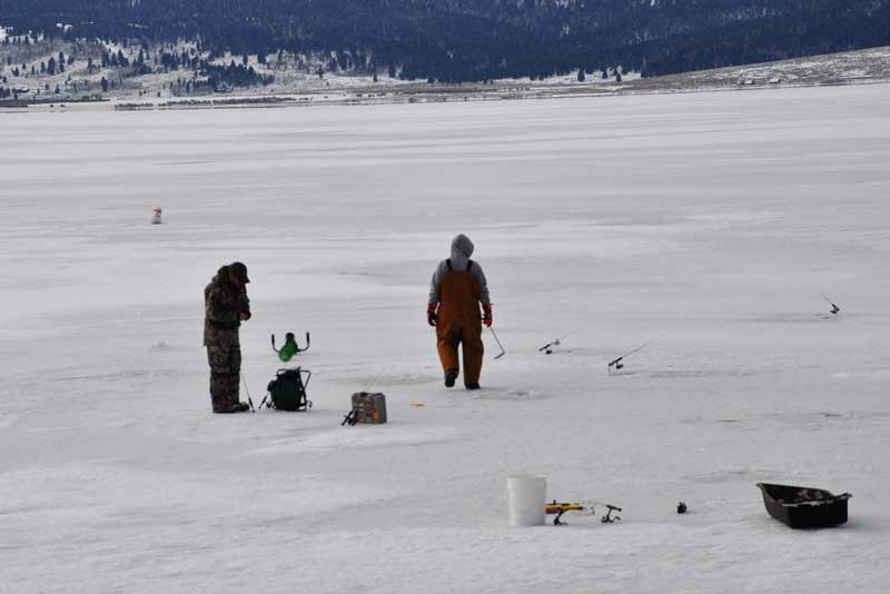 After visiting with Keen and two other Idaho Fish and Game employees fishing near the shore, my two companions and I decided to head down the ice to the mouth of Pittsburg Creek, one of my favorite early season ice fishing spots. With the temperature hovering around zero, we passed an ice hut with two fishermen from Preston who had a large hybrid laying on the ice.
