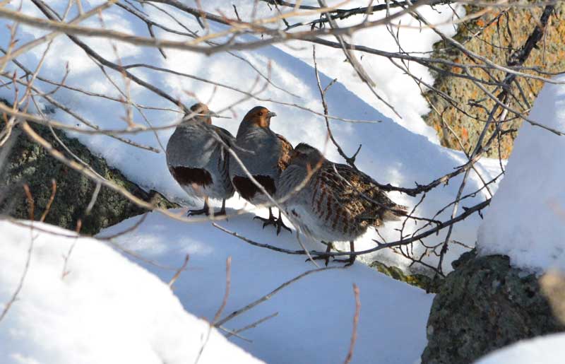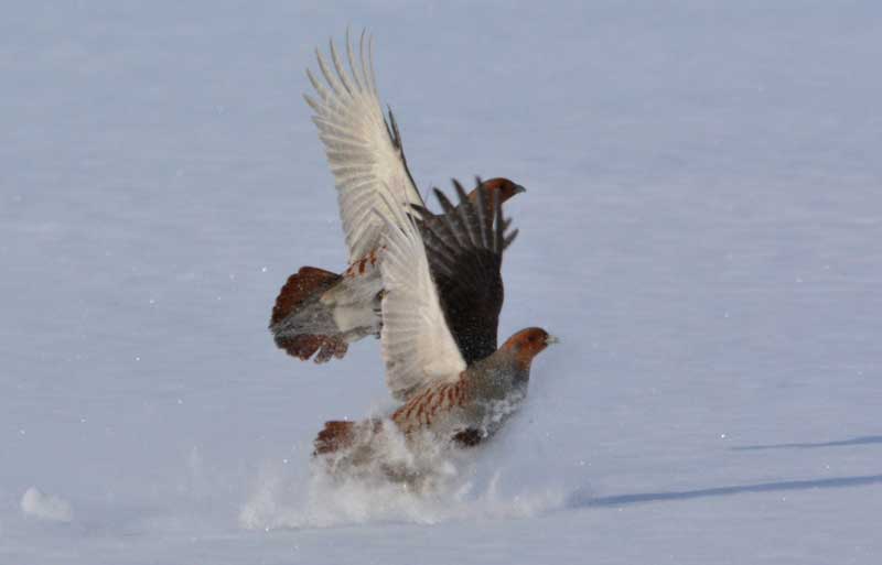 As I walked out to fill my bird feeders in the backyard, the explosion of four Gray partridge from under the 10 inches of new fallen snow scared the jeepers out of me.