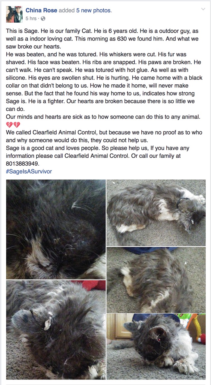 Sage, a 6-year-old gray and white domestic cat, belonged to Clearfield resident China Rose, who posted photos of Sage on Facebook with a detailed description of the signs of abuse she found when the cat made its way back home Wednesday.