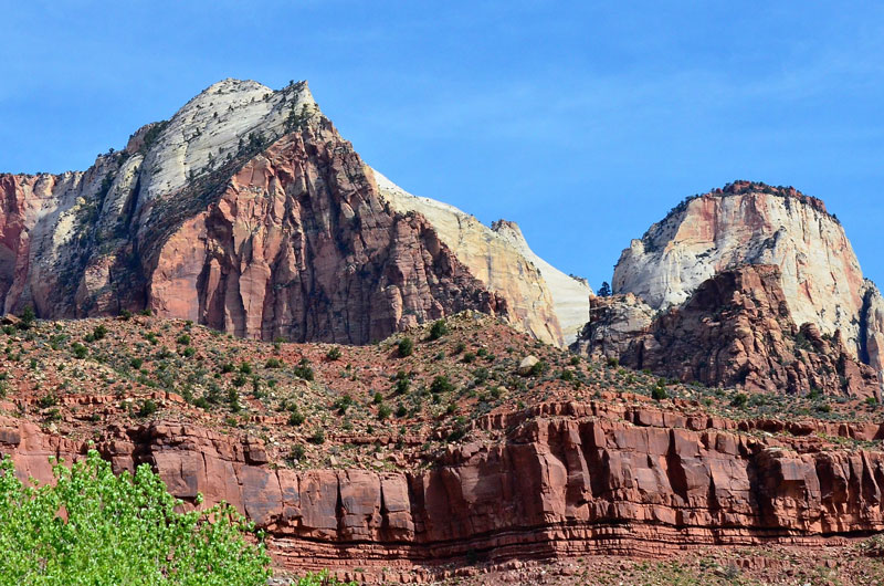 A herd of four mule deer, Broad-tailed humming birds buzzing the new blossoming Indian Paintbrush, the Jacob’s Ladder flowers, the Blue-gray Gnatcatchers, even a Peregrine falcon and a host of other spring flowers encouraged me to take breaks and enliven my soul. The red, white, black-stained sandstone cliffs created by the Virgin River cutting through the rock over millions of years, offered a beauty that was breathtaking. Not that I needed any of my breath to be taken.
