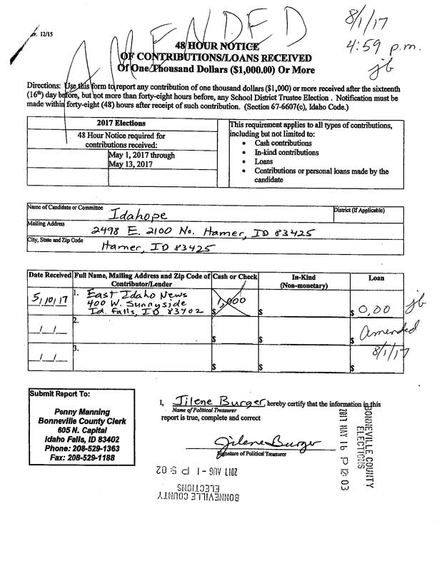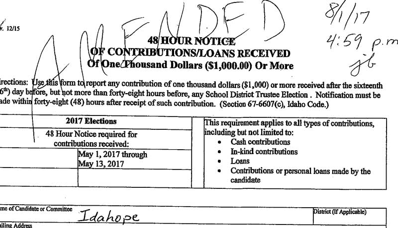 Amended paperwork has now been refiled with Bonneville County that shows a zero dollar contribution from EastIdahoNews.com.