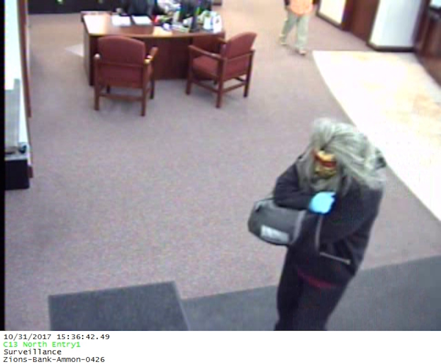 The suspect was wearing a skull mask with long gray hair, a black hoodie and a backpack, according to an emergency alert sent by the Bonneville County Sheriff’s Office. He apparently fled from the bank on foot.