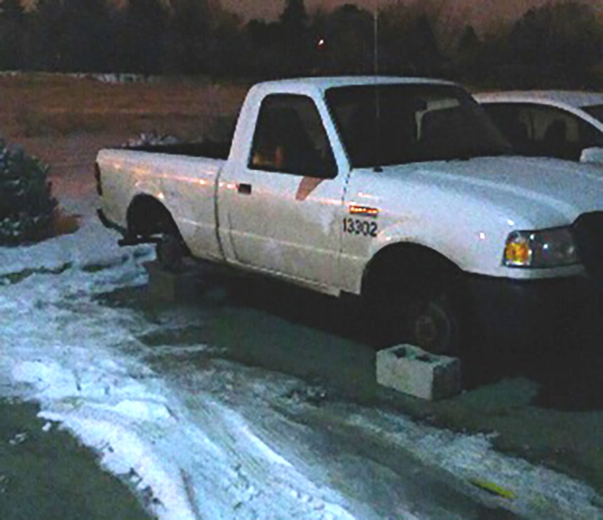 Nathaniel Leonard with O’Reilly Auto Parts on Broadway arrived early Friday morning to open the store only to find that their delivery vehicle, a Ford Ranger was up on cinderblocks missing all four tires.