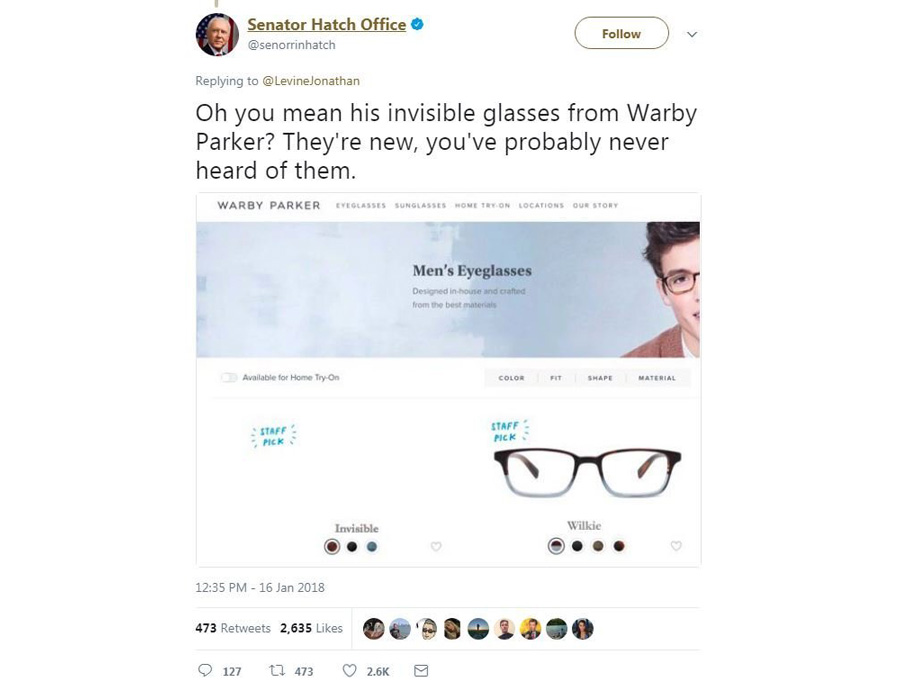 “Oh you mean his invisible glasses from Warby Parker? They’re new, you’ve probably never heard of them,” Hatch’s apparently hipster staffers responded, all in good fun.
