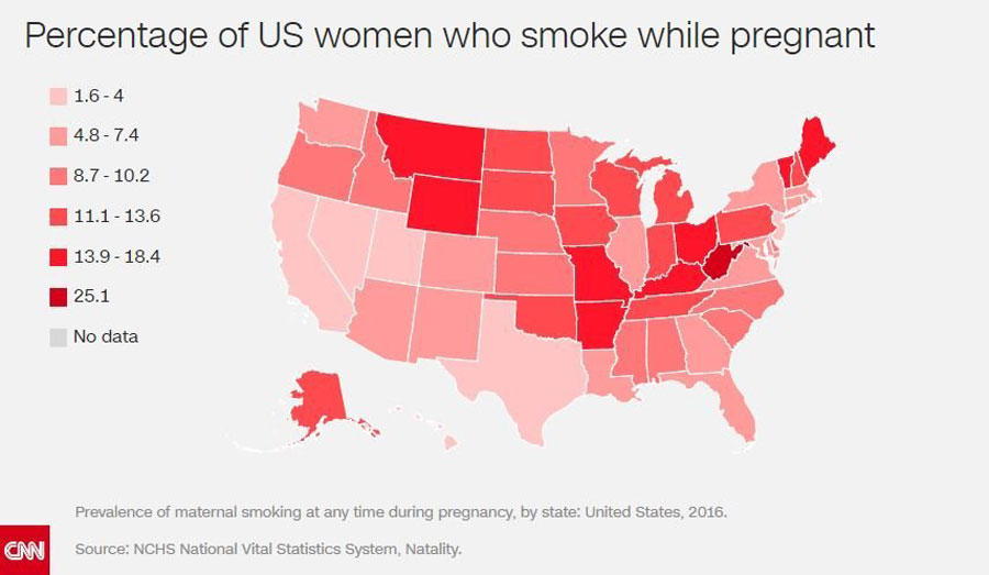 Brown pointed out that some of the states in the new CDC report with the highest prevalence of smoking during pregnancy also tend to have high rates of infant mortality. A CDC data brief released in January showed that, between 2013 and 2015, West Virginia and Kentucky had infant mortality rates higher than the overall national rate.