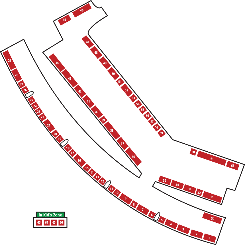 The following list includes vendor names, items from vendors, and space numbers (see map below):