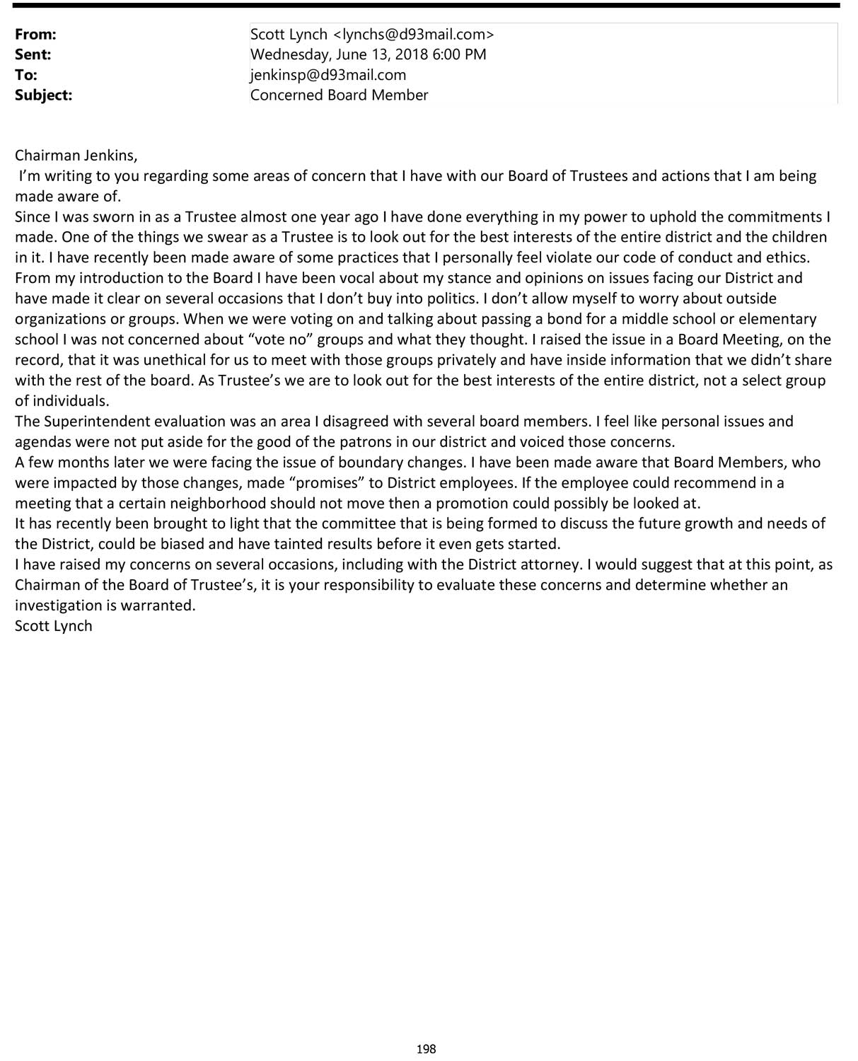Lynch wrote he was concerned about the behind-the-scenes planning of elementary school boundary changes taking place between March and June of this year.