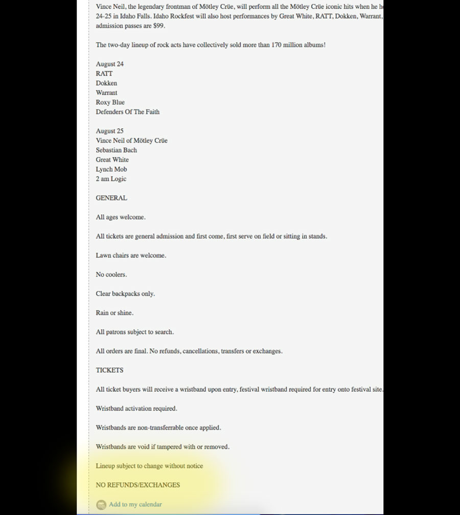 The remaining tickets were purchased online through Idaho Rockfest. Heyrend says he technically doesn’t have to refund anybody because there was a “NO REFUNDS/EXCHANGES” disclaimer on the website prior to making the purchase.