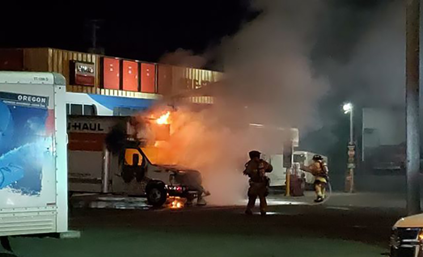 The Idaho Falls Fire Department was called to the U-Haul Neighborhood Dealer at 5634 South Yellowstone Highway around 11:30 p.m. When firefighters arrived, they discovered the front of a truck in the parking lot was fully engulfed in flames.