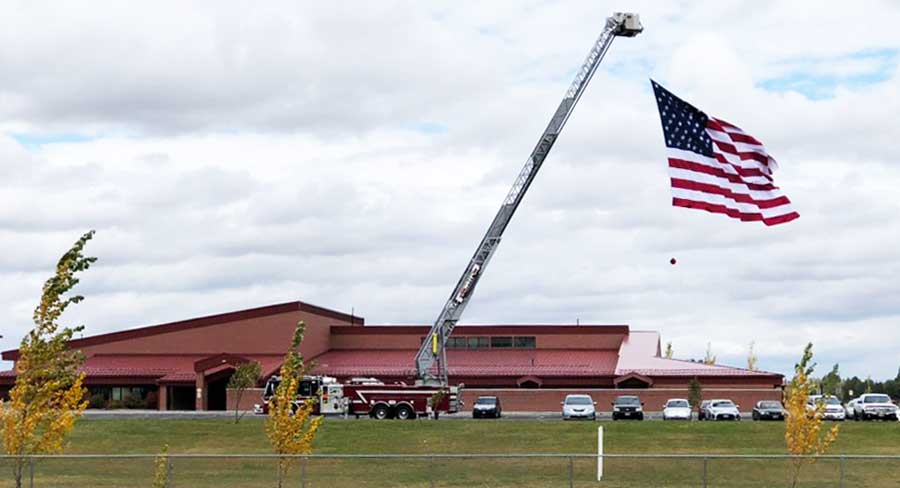 Local Firefighters hung a massive flag from a ladder truck in the Woodland Hills parking lot in Roberts’ remembrance.