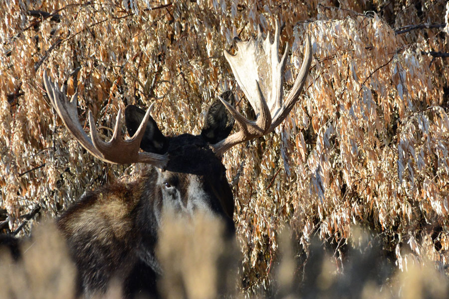 While scrambling through some large lava rocks on the east side of Market Lake’s Main Marsh, I flushed a cackling cock pheasant that was followed quickly by two more, plus a quiet hen. After I got my heart settled back down, I perched myself on a large boulder and found myself eye to eye with a large bull moose.