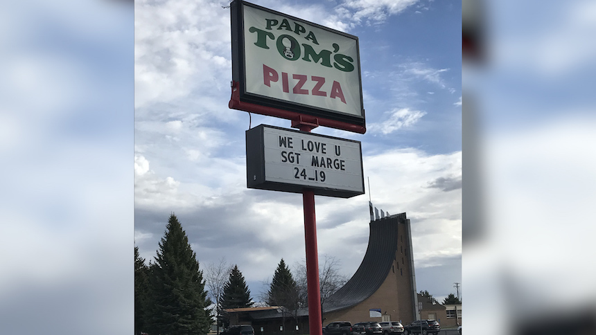 As the sign outside Papa Tom’s pizza reads today, We love you, Sgt. Marge.