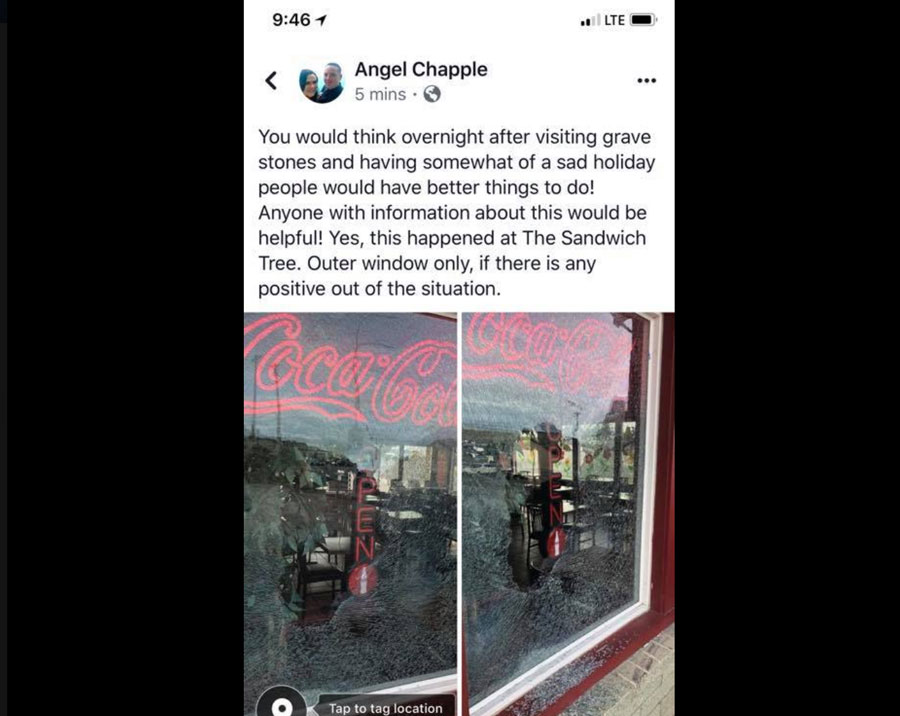 Owner Angel Chapple posted to the company’s Facebook wall and said, “You would think overnight after visiting gravestones people would have better things to do! Anyone with information about this would be helpful! Yes, this happened at The Sandwich Tree. Outer window only, if there is any positive out of the situation.”