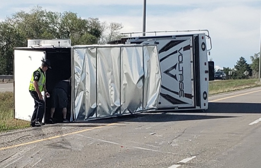IDAHO FALLS — A camp trailer and attachment, hooked to a pickup truck, tipped on Interstate 15 at the on-ramp for US Highway 20 Wednesday evening.