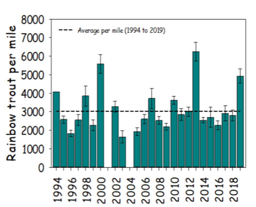 “We marked fish on May 13 and recaptured fish on the 15,” says F&G Fisheries Biologist John Heckel. “Based on the number of trout marked and recaptured, the estimated number of rainbow trout larger than six inches for this year (2019) was 4,924 per mile.” This is an increase over Fish and Games’ 2018 survey that estimated rainbow trout populations at 2,796 per mile. Heckel was also able to estimate the abundance of mountain whitefish at 3,201 per mile.