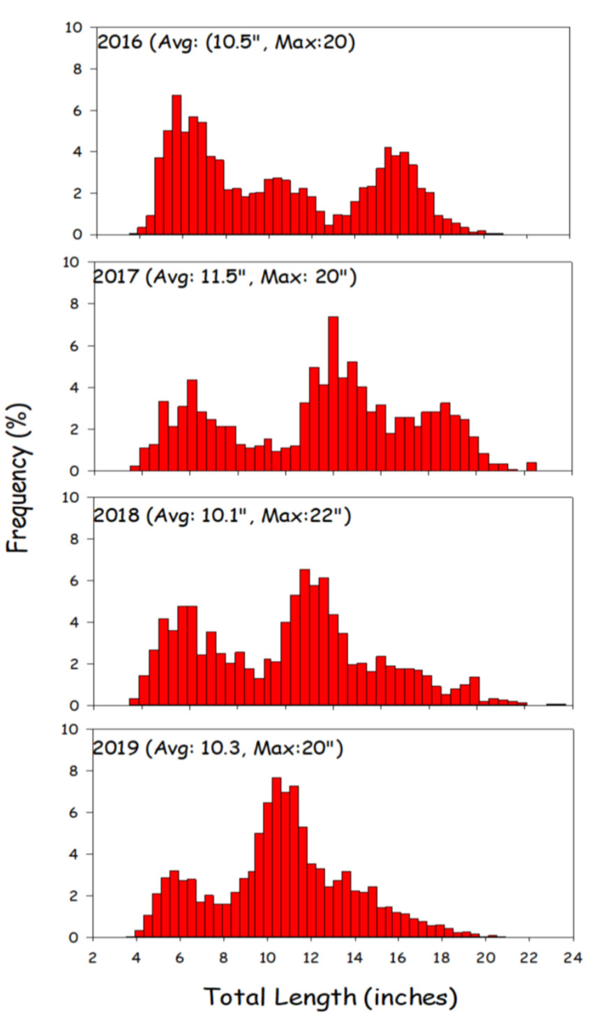The average size of rainbow trout increased .2 inches in 2019 as well. “The population size structure is encouraging, given that two size classes of trout near 6 inches and 12 inches are present and recruiting to the fishery,” explains Heckel. The largest rainbow trout surveyed in Box Canyon this year was 20 inches long.
