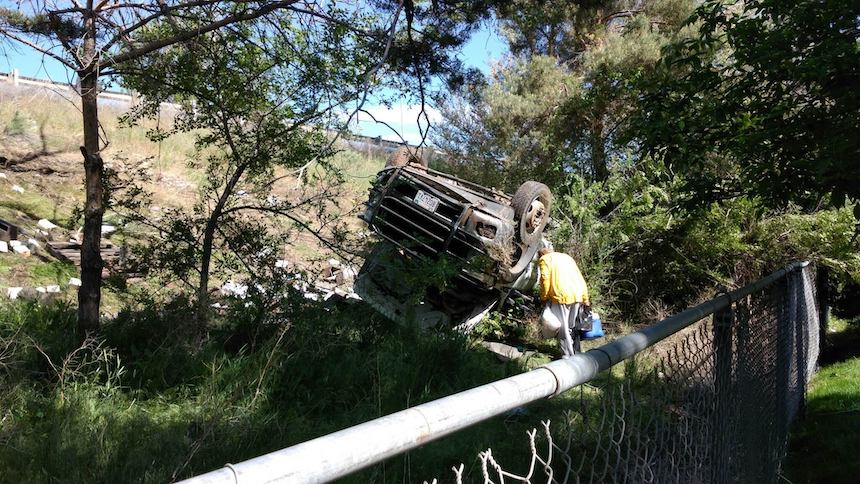 Both vehicles went through the guardrail on the right side of the roadway and down the embankment. Suarez’s vehicle rolled and came to rest on its top.