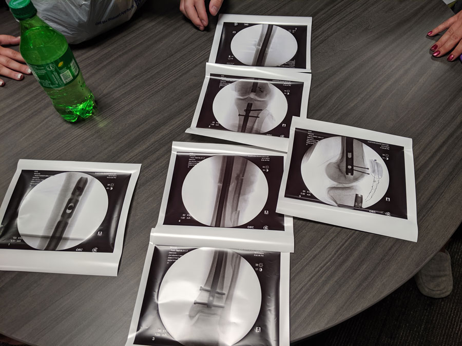 “The bottom portion of his knee cap was destroyed,” Saxton says. “They went in and removed all the bone fragments, severed the tendon along his knee and smoothed out his knee cap.”