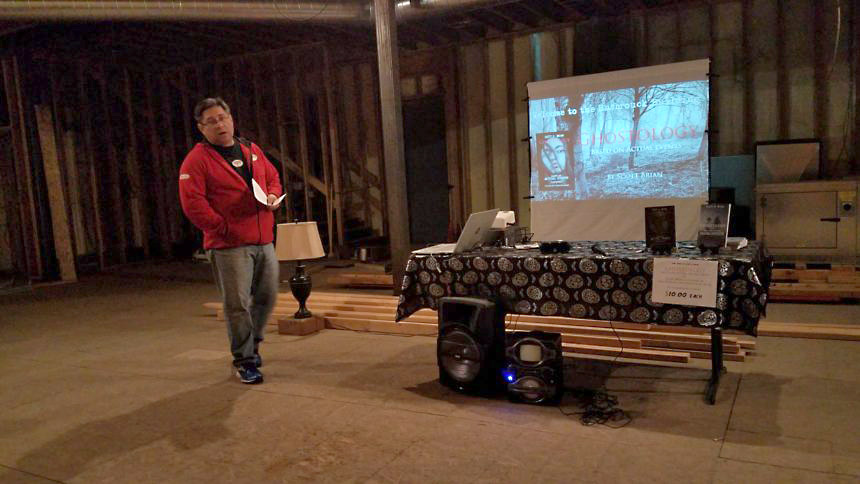 About two dozen people crowded into the basement of the Hasbrouck Building in Idaho Falls on Friday night as ghostologist Scott Brian addressed a spirit he had a previous encounter with at that very location. People asked various questions, getting no response as Brian held aloft a meter that measures EMF (electromagnetic fields).