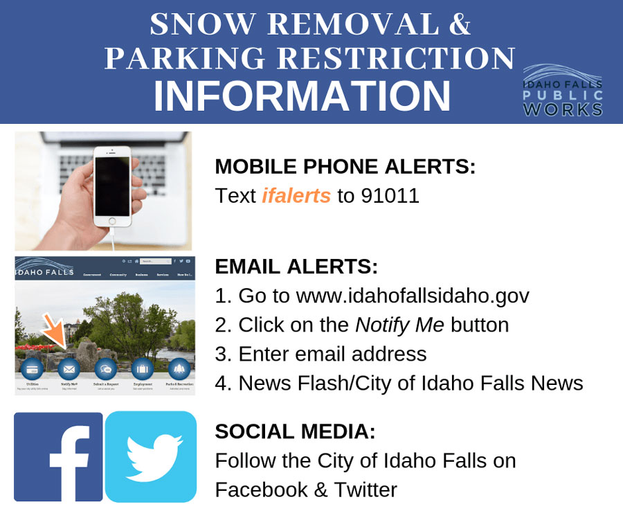 • To sign up for city news releases, emergency alerts and other notifications, such as snow events, click on the blue Notify Me button on the homepage of the city’s website. (The snow removal alerts are sent from the City of Idaho Falls News category under News Flash.)