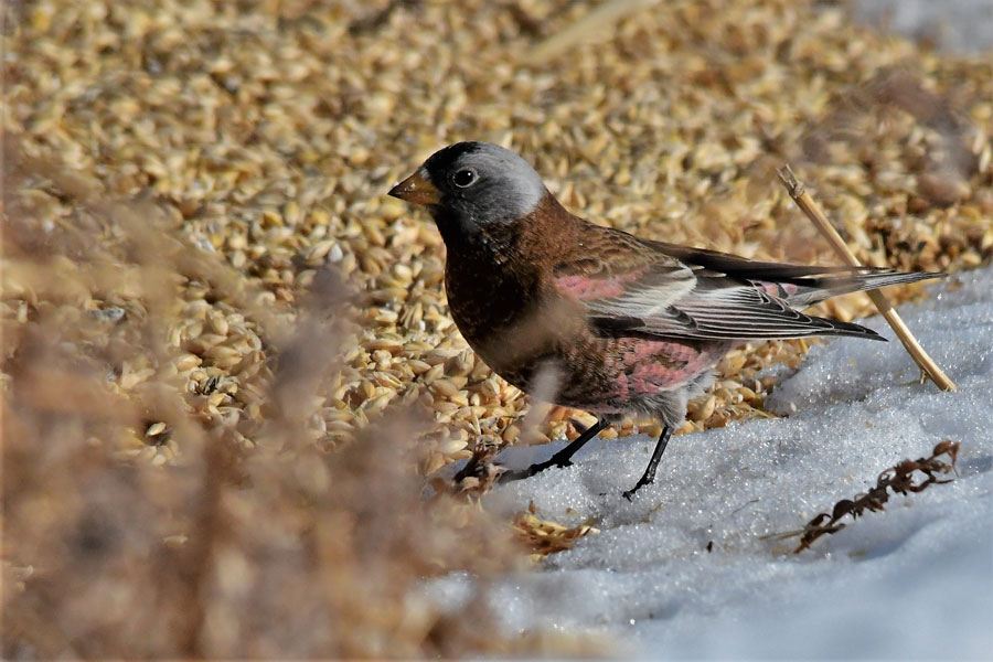 A light-colored raptor flew over our heads twice as we were trying to photograph about 45 Gray-crowned Rosy finches near the Walker Siding on the Rexburg Bench last Saturday. The sleek bird was looking for a Sharp-tailed grouse to flush for dinner, but the six grouse stayed hidden under the farm machinery.