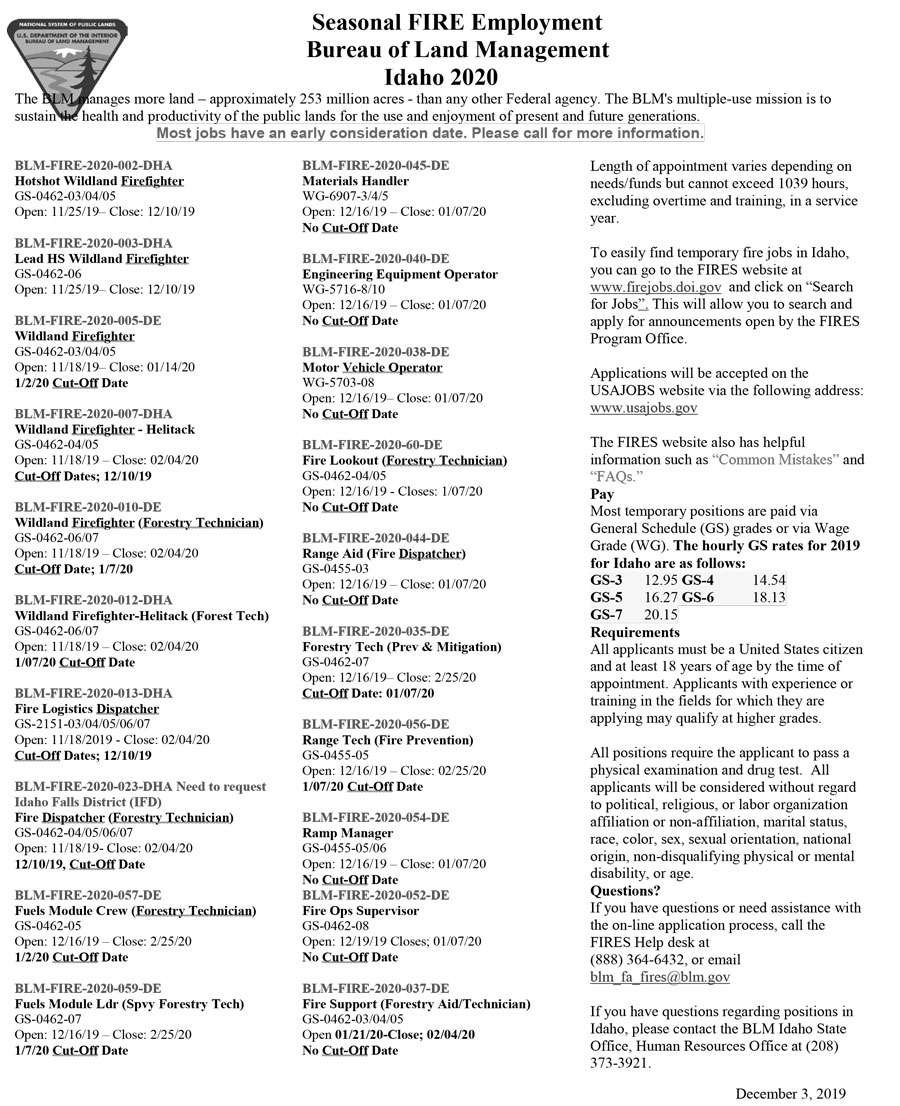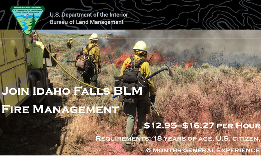 Visit this website and click on the BLM Idaho Fire and Aviation-Job Announcements tab for more information. For assistance in applying, please contact Kris Bruington in Idaho Falls, (208) 524-7668; Cory Berkebile in Pocatello, (208) 478-6351; or Jeff Knudson in Salmon, (208) 756-5497.