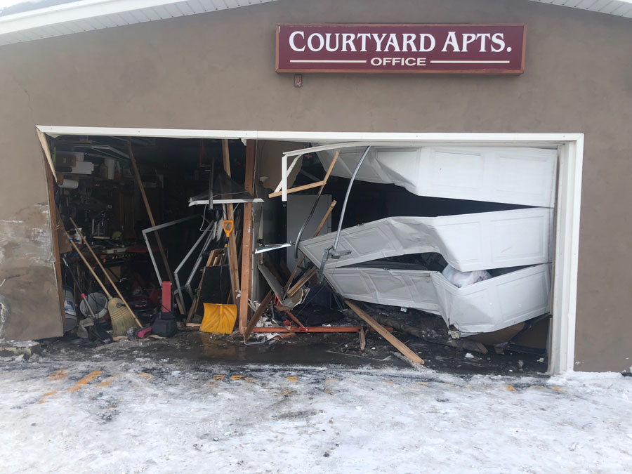 IDAHO FALLS — A man in a pickup truck crashed into Courtyard Apartments’ garage and office area, taking down part of a fence along the way Monday.