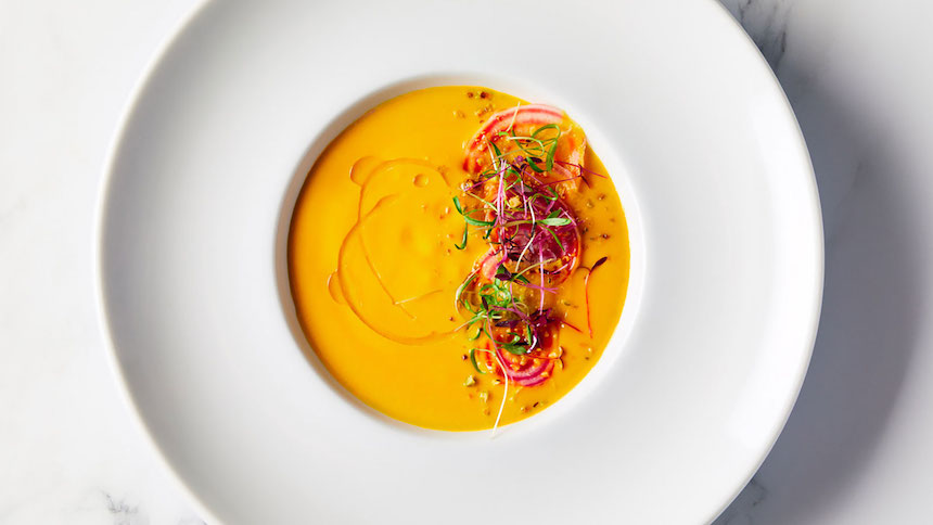Guests will be served a vibrant chilled golden beet soup topped with shaved candy-striped beets and pistachios.