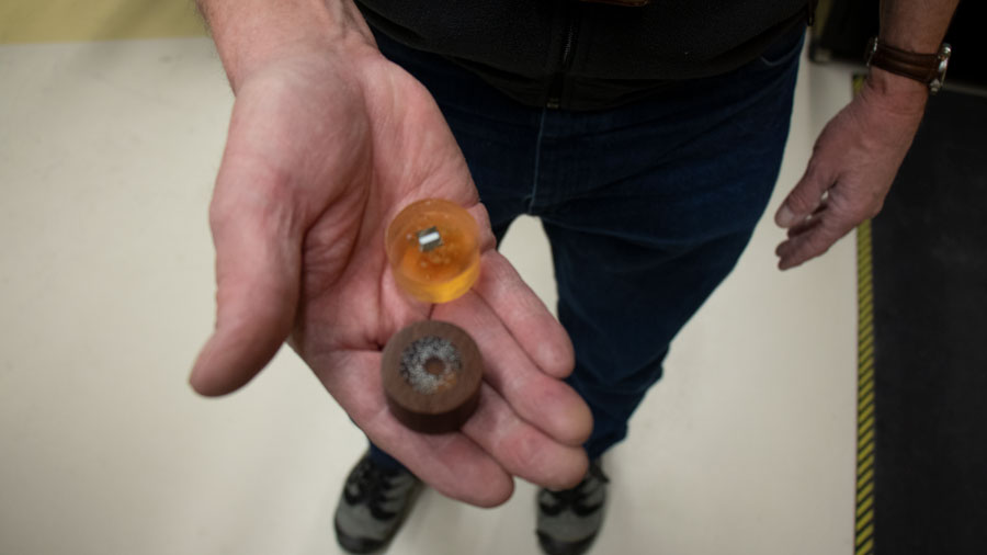 To prepare samples, he often has to cut a section of a fuel pin (similar to a tube). He then places the section into a mount with epoxy glue. As the glue is heated, the item hardens. Frickey then looks through a periscope to grind and polish the experiment for a “mere finish.”