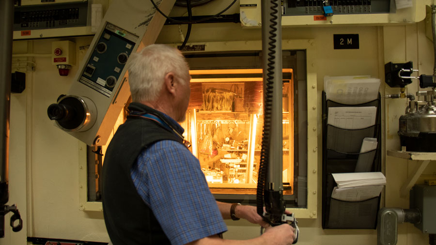 The containment box isn’t a huge space, but it’s home to certain machines such as a grinder, polisher, saw and other tools that have been built for specific projects. Frickey’s a hot cell operator, and his job is to turn radioactive material and fuel into something researchers can study under a microscope.