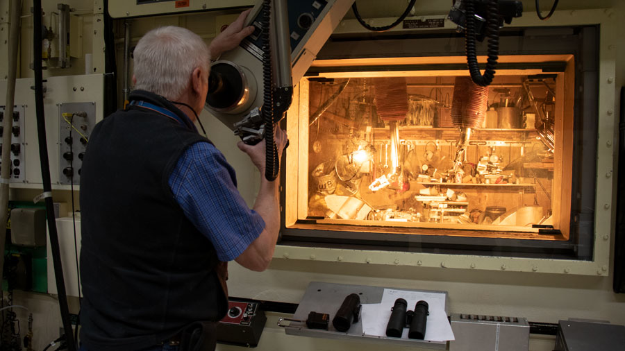 Nobody’s been in the main hot cell since the mid-’70s due to the highly radioactive materials inside. It’s in the Hot Fuel Examination Facility, which is a building where destructive examinations take place. Employees work at about 15 windows that wrap around the main hot cell. The windows have several layers of thick glass for protection. Frickey works at a window called a containment box.