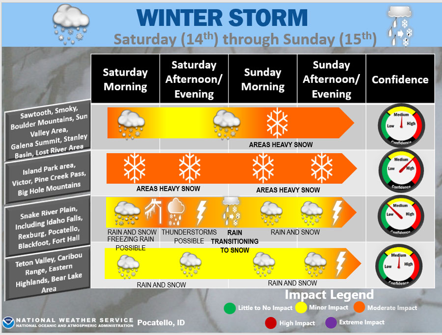 A mix of rain and snow is likely Saturday with mountain snow and valley rain initially. Expect rain showers with freezing rain Saturday morning in the Snake River plain. There will be a gradual change to snow Saturday night. The NWS reports it will be a wet snow that will transition back into rain Sunday.