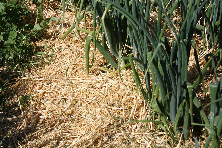 Since onions have a shallow root system, they do not compete well with weeds and can be affected by fluctuations in soil moisture. Keep the moisture level consistent throughout the growing season. Periods of drought during the growing season can lead to stunting and strong-flavored onions. To manage this, a straw mulch can be applied around them, as you see in the picture below, which helps to maintain soil moisture and prevent weeds.