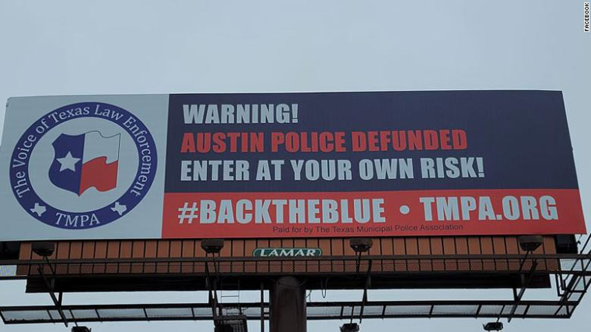 (CNN) — A Texas law enforcement association erected two billboards this week, warning drivers to enter Austin at their own risk after the city reduced its police department budget.