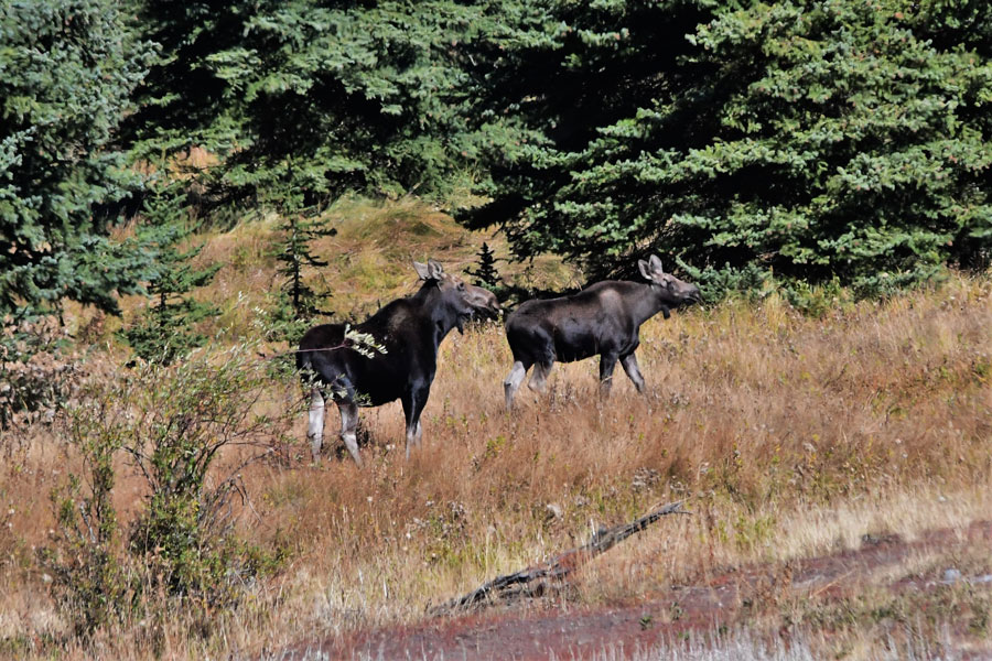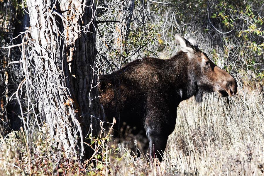 It was Tuesday morning and the two of us had gone to Jackson to try to rustle up a bull moose in a romantic mood, but we were just a few weeks early for them to fight their way into the hearts of the cows. We did find a cow and a calf in the woods of “hippyville,” the small old town of Kelly. The calf was almost as big as the cow and had to kneel as it tried to nurse; the cow gave the calf a forward kick and that game was over.