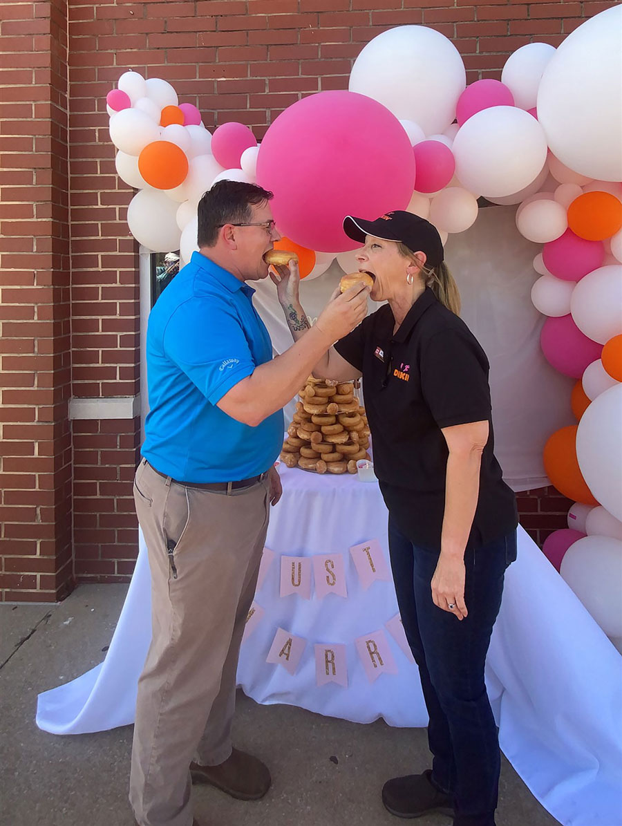 Anyone who visited the store that day received a free glazed or maple glazed donut — the couple’s favorites — to celebrate the occasion. Dozens of customers even returned later during the day to witness the ceremony and cheer them on from their cars, Thompson said.