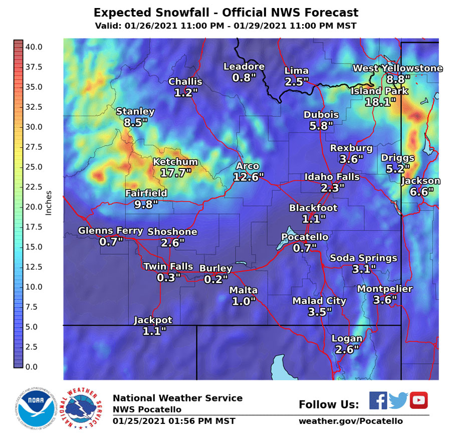 The National Weather Service in Pocatello is forecasting “wet and heavy snow for at least 48 hours.” The areas of impact extend from Stanley and Ketchum to Jackson and from West Yellowstone to Twin Falls and Montpelier. The areas of Blackfoot and Pocatello are not included.