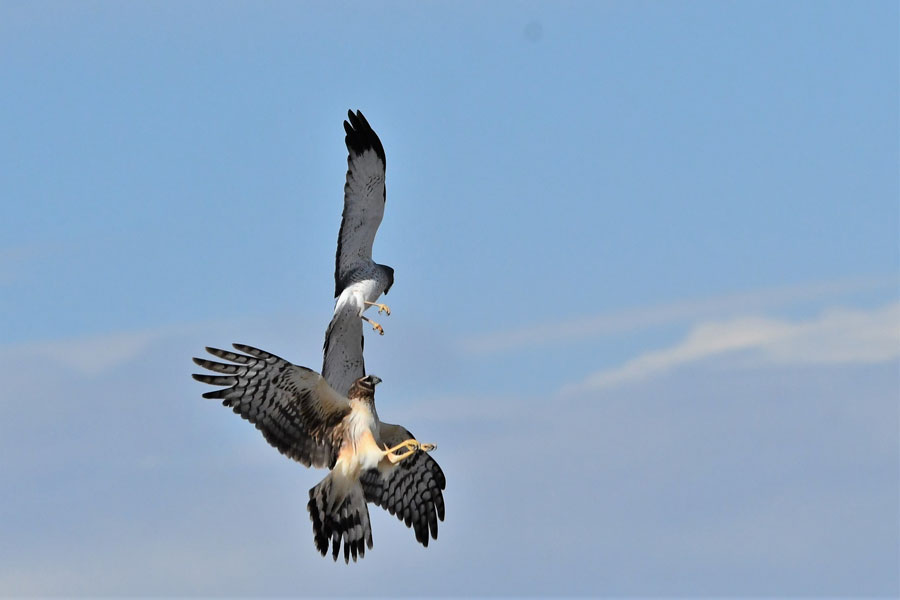 I counted 17 of these Circus cyaneus (circle fliers) as the males started their roller-coaster display by ascending high into the air then barrel rolling into a free-fall. Just before hitting the marsh vegetation covered ground, they head back up. Then as a female came by hunting for food, a male made good his common name (the harrier) and harasses the larger darker female. It was an agnostic attack where no contact is usually made and nothing is exchanged – yet; those actions will come later after the female has chosen who her significant other will be.