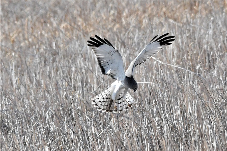 Northern harriers are rare ground nesting hawks and both females and males will pick out their nesting spot and as polygamists, males will attempt to be chosen by more than one female. The females will incubate the four to six eggs while the male’s jobs are to protect the nest and feed the female. When the male harvests food for the female, he will call out to her as he approaches the nest and she will fly up for an air-mail delivery. Once the kids are hatched, he will do an airdrop to them and the female will feed them.