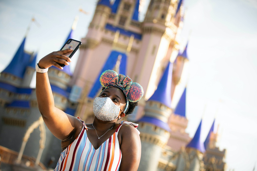 The day began with Disney officials and park employees wearing face coverings gathered in the park’s town square for the morning flag-raising ceremony.