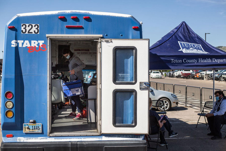 Nurses check in patients under a tent outside the bus and ask patients about any potential COVID-19 symptoms or recent contact with infected individuals. Nurses also patiently describe side effects they might experience after the vaccine, usually a sore arm and mild fever, the Jackson Hole News & Guide reports.