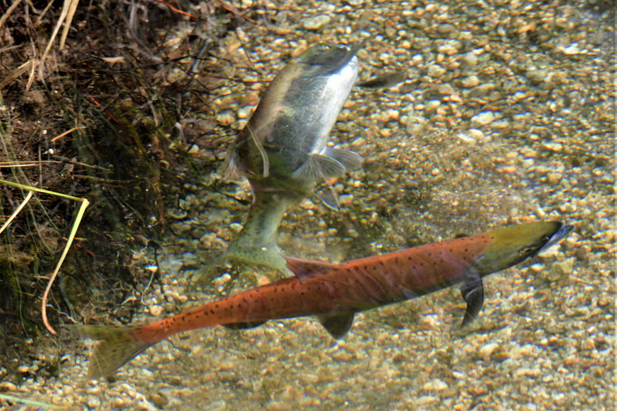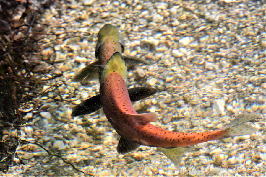 After the nest was ready, the female deposited up to a thousand eggs in the redd and the male l moved in quickly, squirting “milt” over the eggs to fertilize them. This action alerted “single” males that have not been chosen by a female as her “significant other.” As the male attempted to chase off the males, a male would sneak in and quickly attempted to fertilize some of the eggs.
